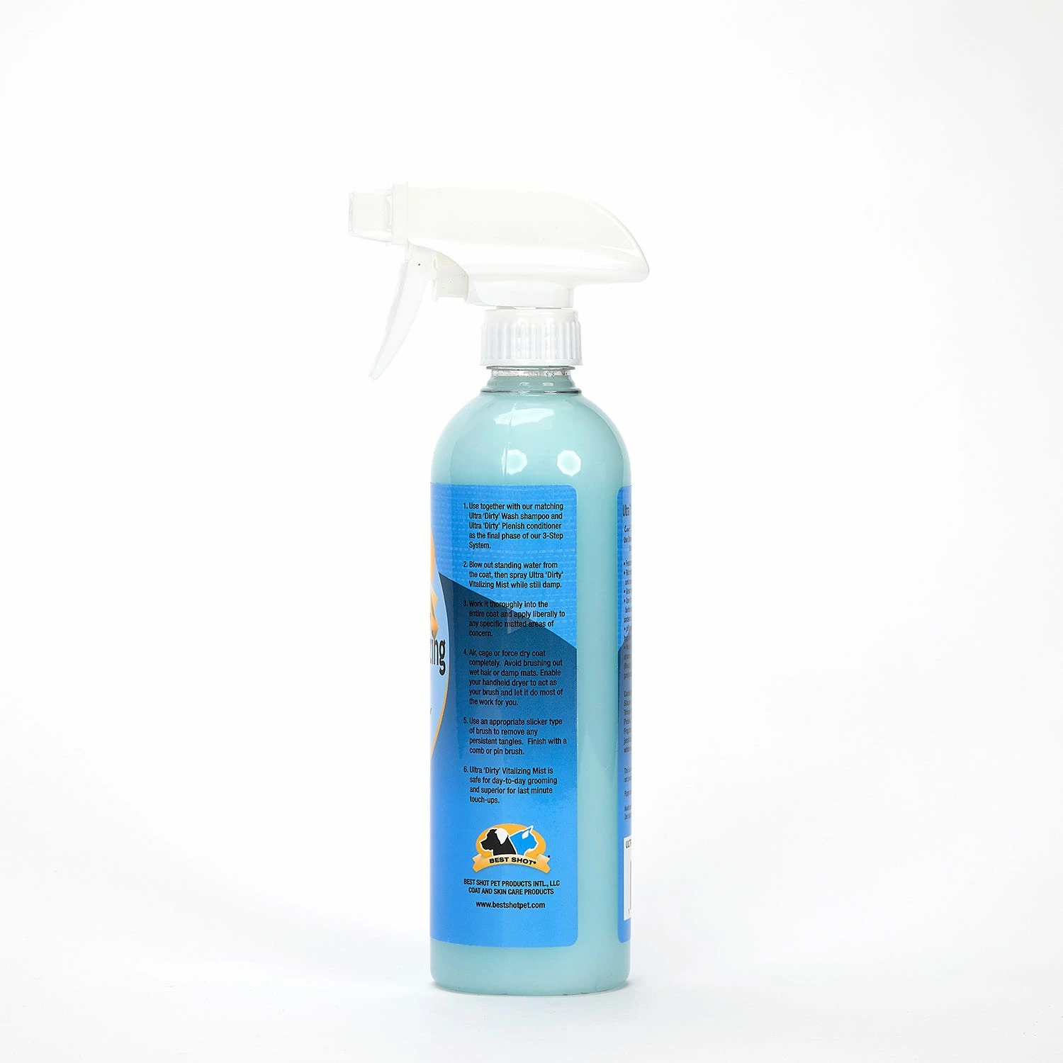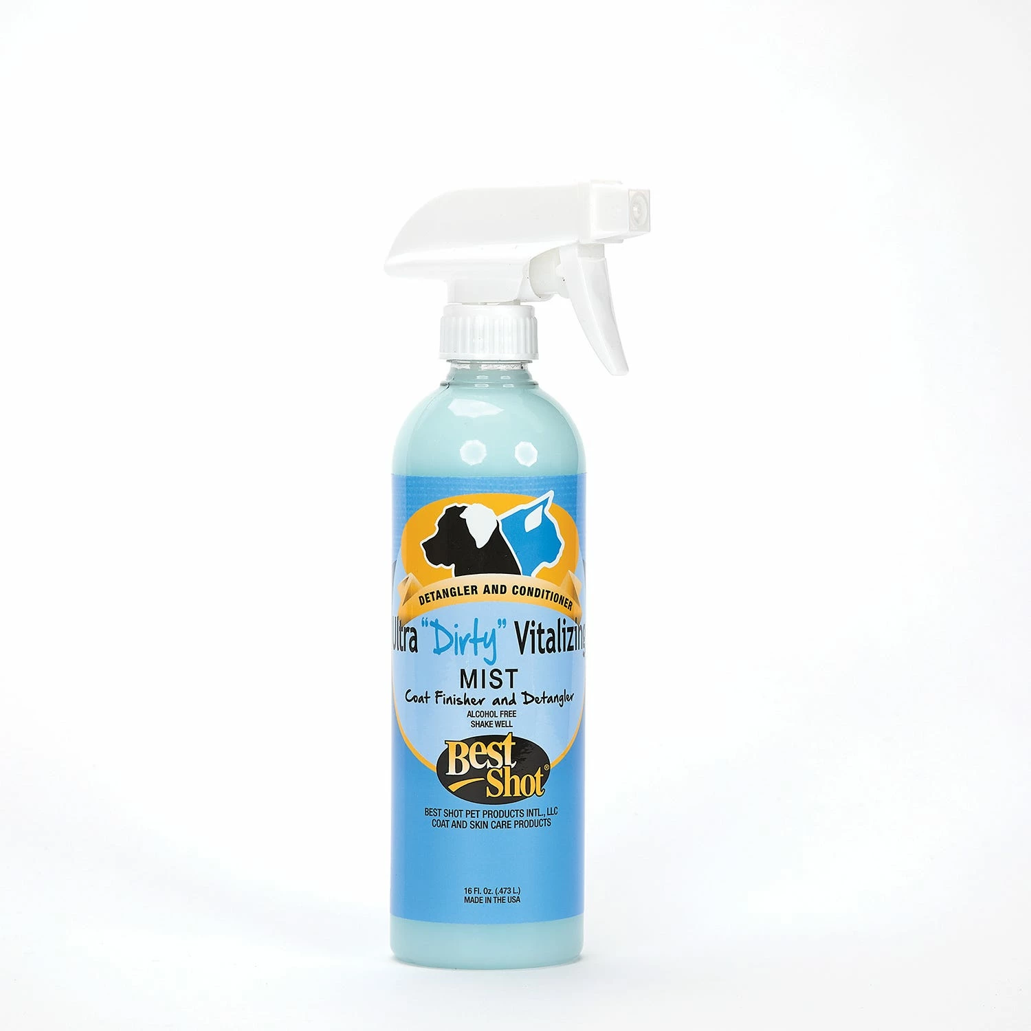 Best Shot® Ultra Dirty Vitalizing Mist is a multi-faceted conditioning spray. Use separately or as Step 3 of our grooming system! Its spray-in/leave-in hydrating conditioners are great between baths for skin, ridding dandruff, shining dull coat, and more! Use for routine brush-outs or apply before drying to release more undercoat. Professional groomers recommend it for loosening mats, de-shedding, freeing tangles, ridding static and speed drying.