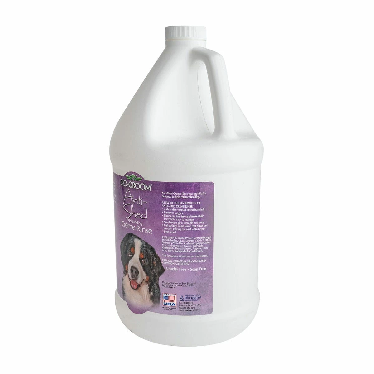 BioGroom® Anti-Shed Deshedding Crème Rinse is a high quality, natural dog conditioner specifically developed to help reduce shedding. Great for double coated and long-haired breeds to reduce shedding. It grips the loose coat and removes stubborn hair and loose undercoat during bathing to cut down on brushing and grooming as a whole. Anti-Shed Crème Rinse also removes tangles!